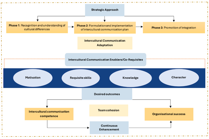In the context of increasing globalisation and workforce diversity, organisations face growing challenges in fostering effective intercultural communication, collaboration, and cohesion among employees from varied cultural backgrounds. Poor intercultural communication can lead to conflict, misunderstanding, and decreased organisational performance. This study aims to propose a comprehensive Intercultural Communication Management Framework (ICMF) to enhance intercultural understanding, reduce communication barriers, and support inclusive, high-performing workplace cultures in multicultural organisations. A qualitative research design was adopted, involving a systematic literature review and analysis of strategic and policy documents to identify key gaps in current intercultural communication practices. The framework is theoretically grounded in Hofstede’s Cultural Dimensions Theory, offering a structured basis for analysing cross-cultural dynamics. The study finds that effective intercultural communication requires more than individual adaptation; it demands an organisational commitment to structured development of intercultural competencies. The proposed ICMF includes three core phases, recognition, planning, and integration, and is supported by four key enablers: motivation, knowledge, skills, and character. These are presented as learnable competencies rather than fixed traits, with particular emphasis on empathy, flexibility, and curiosity. A strategically driven and continuously enhanced approach to intercultural communication can significantly improve intercultural competence and employee cohesion in diverse organisations. The ICMF provides a practical and adaptable model for guiding such efforts. This study contributes a novel conceptual framework that positions intercultural communication as a strategic organisational function, not merely a soft skill. It bridges a critical gap by integrating ethical principles, individual competencies, and institutional strategies. Future research should empirically validate the framework across diverse sectors to assess its practical impact on team performance and organisational outcomes.